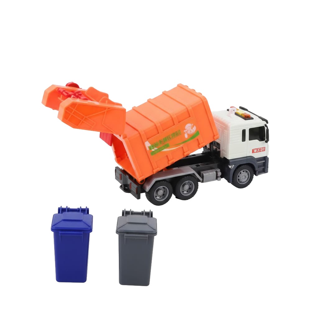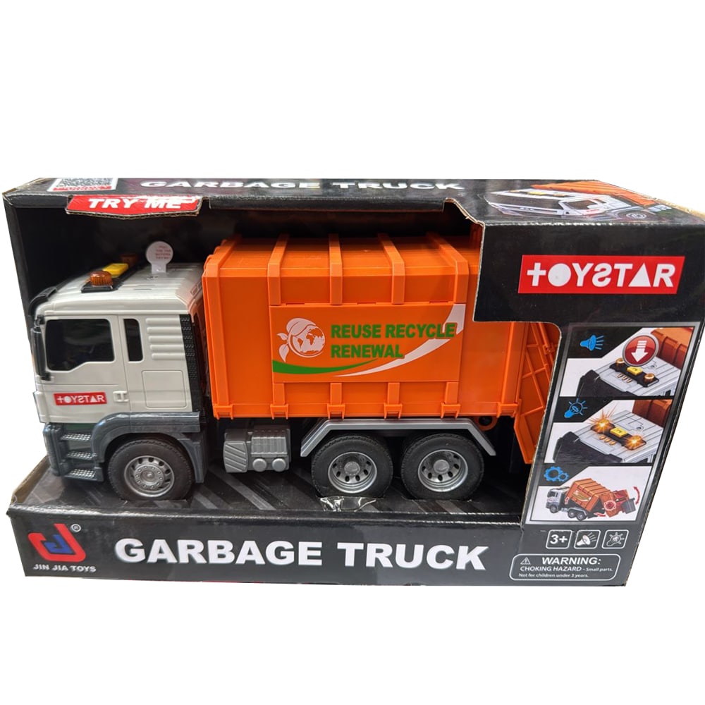 کامیون زباله نارنجی ToyStar با در پشتی بازشو، مخزن بالابرنده و دو سطل زباله کوچک، تجربهای واقعی از جمعآوری زباله را برای کودک شبیهسازی میکند. این مدل با نور و صدای واقعی، به آموزش مفاهیم محیطزیستی و تفکیک زباله کمک میکند.