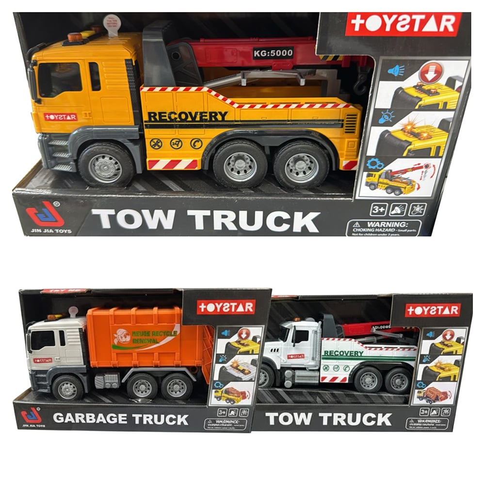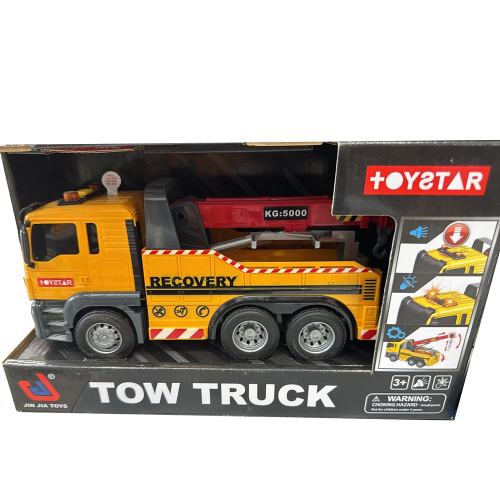 یدککش جرثقیلدار ToyStar، یک کامیون چندمنظوره با بازوی قابل تنظیم (19 تا 25.5 سانتیمتر) است که میتواند بهعنوان جرثقیل ساختمانی یا کامیون حملبار استفاده شود. این مدل دارای سه نوع افکت صوتی و حرکت اینرسی سریع بوده و برای بازیهای ساختوساز و امدادی ایدهآل است.